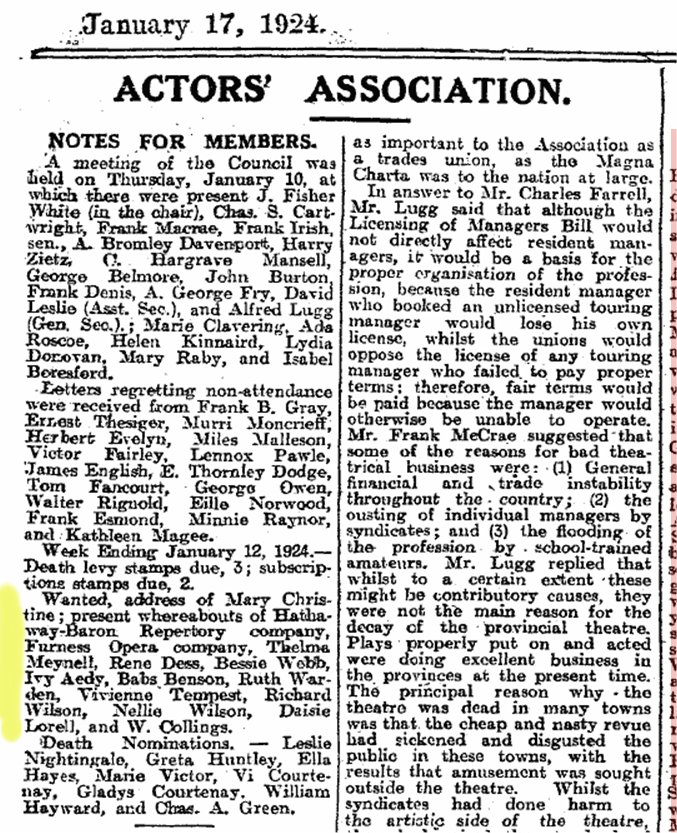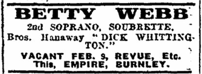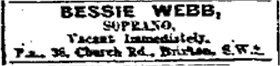 'Season's greetings' messages in The Stage. Both Bessie Webb and Vivienne Tempest did so in the 29th December 1923