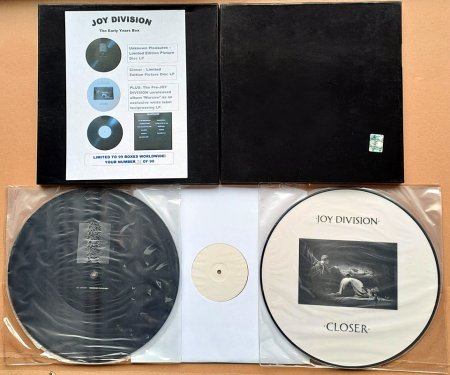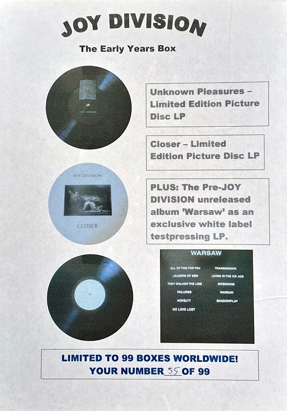 The picture discs have clear plastic sleeves, and the Warsaw LP is housed inside a plain white inner sleeve with die cut label holes