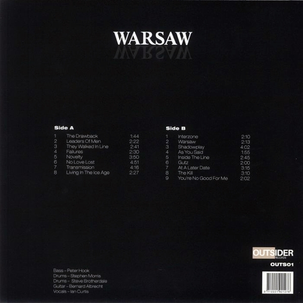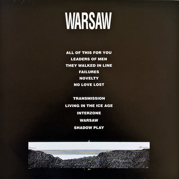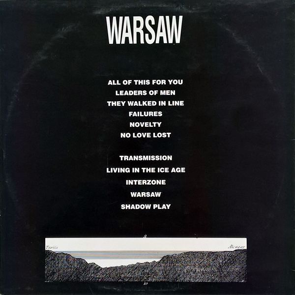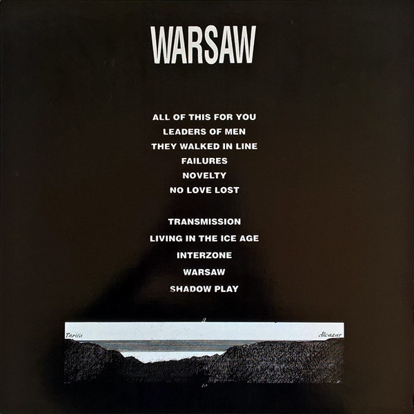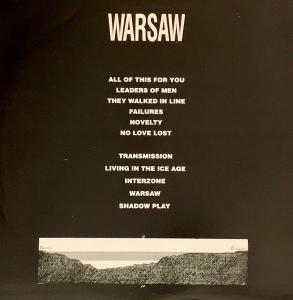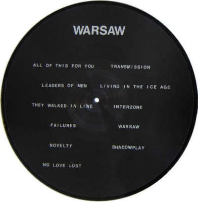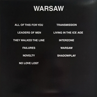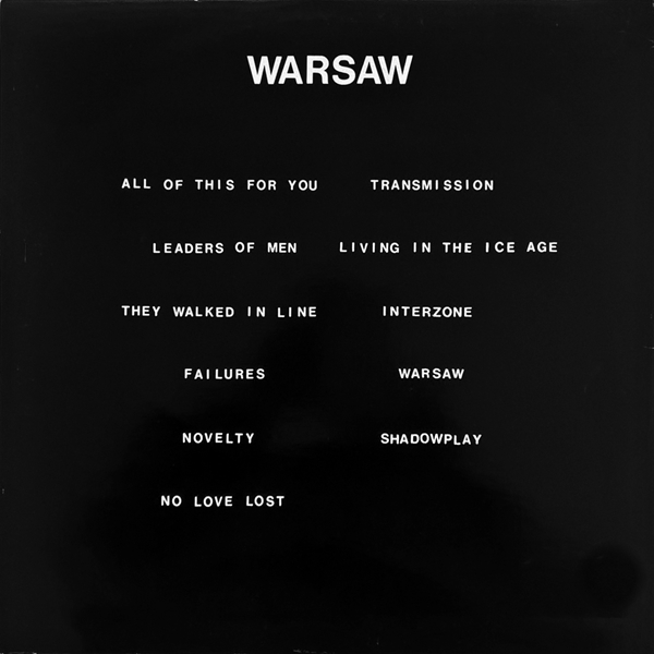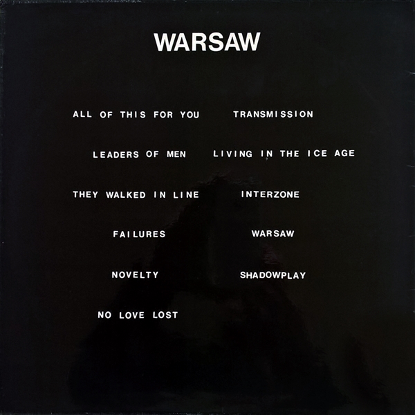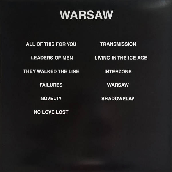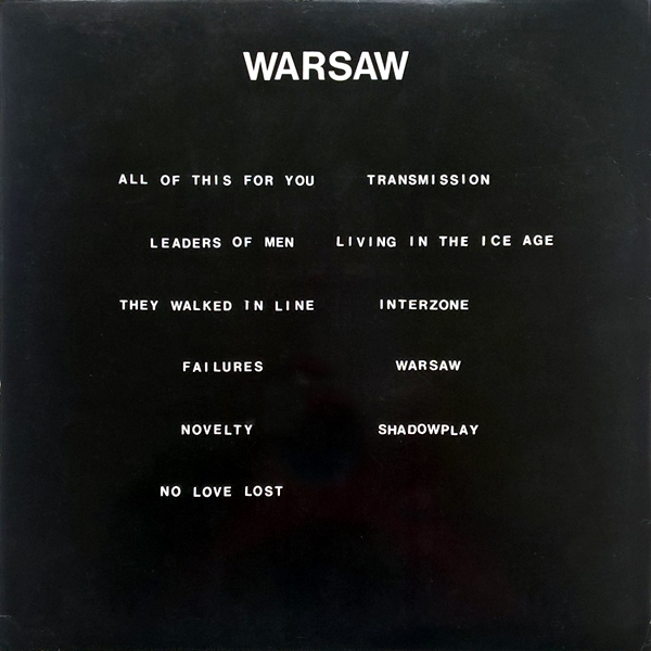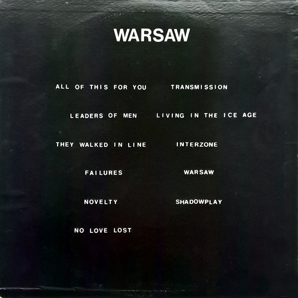 All of this for you Transmission The leaders of men Living in the ice age They walked in line Interzone Failures Warsaw Novelty Shadowplay No love lost A black vinyl, plain white label, version of this LP was later included in The Early Years Box